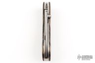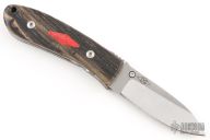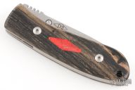 This DK-FH linerlock folder by Dozier Knives has a satin finished D2 stainless steel drop point blade with a notched thumbrest and a single thumbstud. Handle has black/white ebony wood (from Laos) scales with red coral escutcheons, titanium liners and backspacer. New from maker!