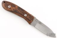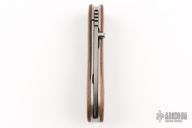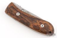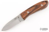 This DK-FH linerlock folder by Dozier Knives has a satin finished D2 stainless steel drop point blade with a notched thumbrest and a single thumbstud. Handle has bocote wood scales, titanium liners and backspacer. New from maker!