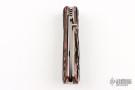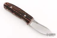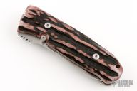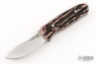 This DK-NM Nesmuk linerlock folder by Dozier Knives has a satin finished stainless steel drop point blade with a notched thumbrest and a single thumbstud. Handle has dyed sambar stag scales, titanium liners and backspacer. New from maker!