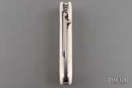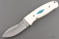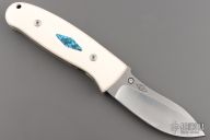 This DK-NM Nesmuk linerlock folder by Dozier Knives has a satin finished stainless steel drop point blade with a notched thumbrest and a single thumbstud. Handle has ivory G-10 scales with turquoise escutcheons, titanium liners and backspacer. New from maker!