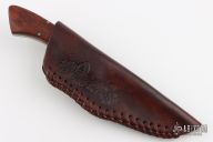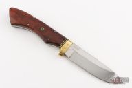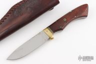 This hunter by RDS Knives features a mirror polished blade with fileworked thumbrest, .139" blade stock and 1.095" blade depth, full tang construction. The handle has a brass guard with a mosaic pin, Brazilian cherrywood scales with mosaic pins, black/brass spacers. Comes with a brown leather sheath. Has a couple light scratches, otherwise excellent condition.