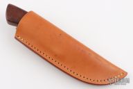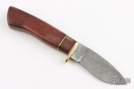 This knife features a Damascus blade with .131" blade stock and 1.259" blade depth, hidden tang construction. The handle has a brass guard and wood grip with black and brass spacers. Comes with a brown leather sheath. Excellent condition.
