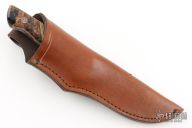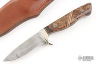 This knife has a makers mark that looks like a Saber Tooth tiger skull and under that says Missoula Montana, there something above the logo, but i can't make out what it says, please let us know if you know who this is. It has a Damascus blade with .133" blade stock and .959" blade depth, full tang construction. The handle has a nickel silver guard, burl wood scales with mosaic pins, blue lines and some spacers in the scales. Comes with a brown leather sheath. Has some light scratches, otherwise excellent condition.