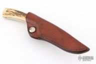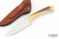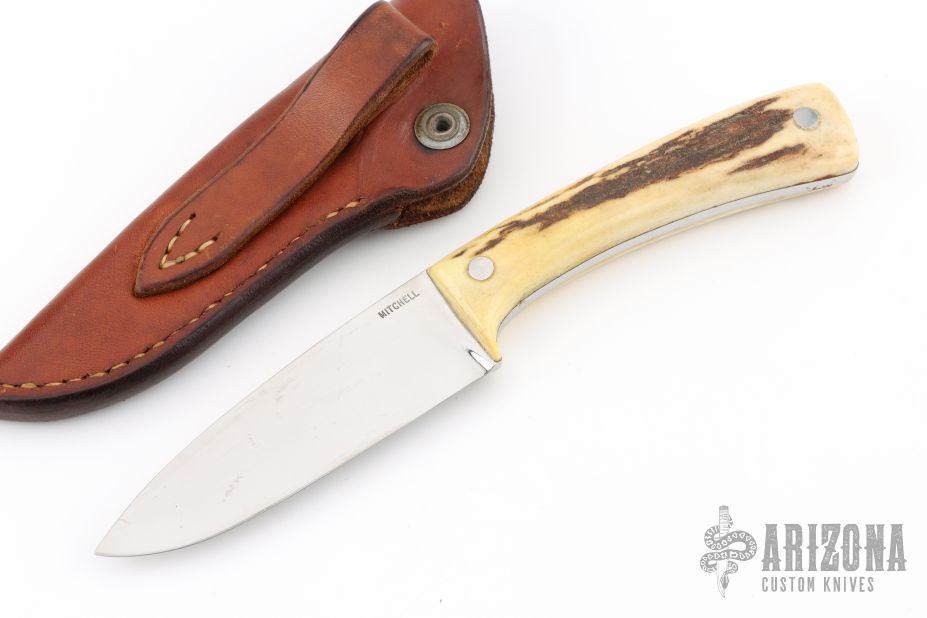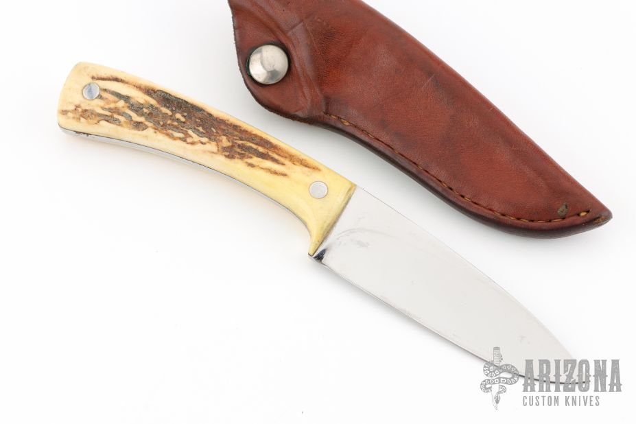 This hunter by Harry Mitchell features a mirror polished blade with .176" blade stock and 1.250" blade depth, full tang construction. The handle has stag scales. Comes with a brown leather sheath. Has some scratches and some oxidation on the tang, otherwise good condition.