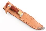 This knife features a mirror polished blade with file worked spine, .146" blade stock and .921" blade depth, full tang construction. The handle has brass bolsters and maple burl scales with brass pins, file worked tang. Comes with a brown leather sheath. Has some light scratches, otherwise excellent condition.