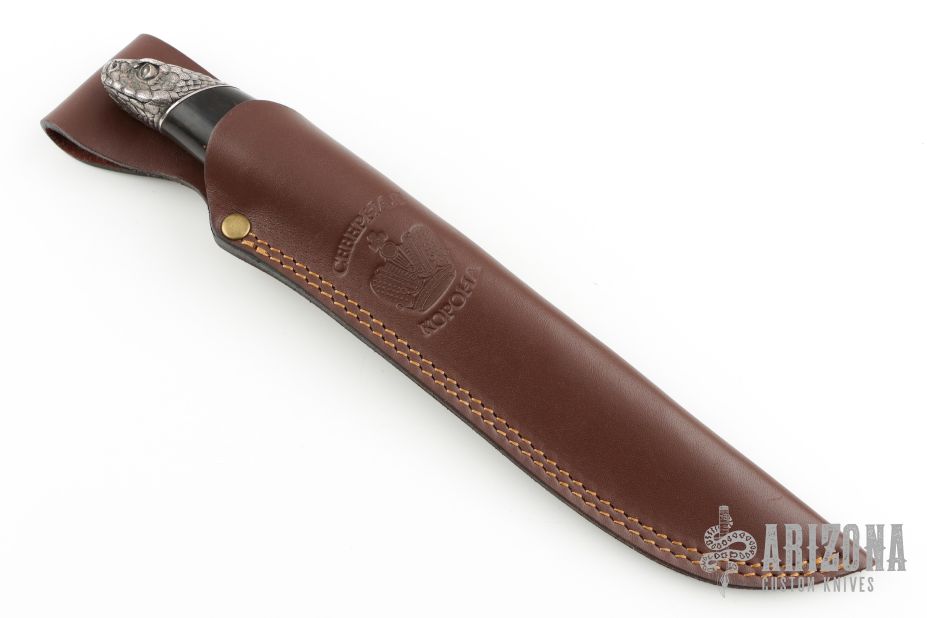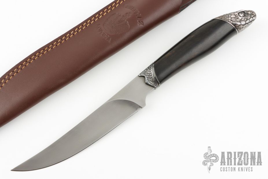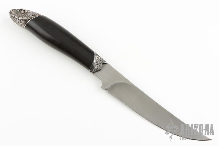 This knife features a Damascus upswept blade, .190" blade stock and 1.009" blade depth, hidden tang construction. The handle has a silver guard and butt with a Anaconda's head, with an ebony wood grip. Comes with a brown leather sheath. Excellent condition.