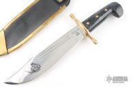 This vintage Bowie from Case Knives features a mirror polished clip point blade with false top edge, .170" blade stock and 2.012" blade stock, hidden tang construction. Daniel Boon Etching on presentation side. The handle is comprised of brass double guard with a black composite handle over hidden tang construction. Includes original leather sheath with belt loop. Has some scratches, the brass parry guard has been removed, otherwise good condition.