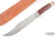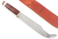 This Trail Maker by Marbles features a clip point mirror finished blade with false top edge, .267" blade stock and 1.638" blade depth, hidden tang construction. The handle has a brass guard, stag butt, stacked leather grip and black/red spacer pattern. Comes with original brown leather sheath. Has light scratches and patina, otherwise excellent condition. "M.S.A.-1992" on the blade.