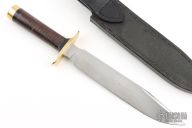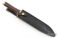 This knife features a hand rub satin finished blade with false top edge, .222" blade stock and 1.408" blade depth, hidden tang construction. The handle has a brass guard and butt with stacked leather grip and black G-10 spacers. Comes with a black leather sheath. Has some light scratches and patina, otherwise good condition.