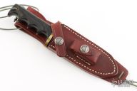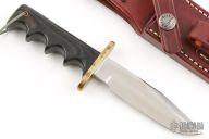 This is a miniature version of Randall's Model 14 Attack. The Model 14 was designed to meet the demand for an almost indestructible all-purpose knife, though it is especially suited for combat and survival purposes. #2052. Satin finished blade with sharpened top edge, .177" blade stock and .833" blade depth, full tang construction. The handle has a brass guard and black linen micarta grip, lanyard hole at the butt. Knife is in excellent condition. Comes with original brown leather sheath.