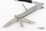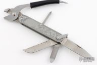 This 4x4 Tool Mate from Al Mark Knives features a drop point blade, a saw blade, nail file/pry bar combo and Phillips head screwdriver. Also includes pliers with a leather wrapped handle. Lanyard bail rotates over the plier handle to lock closed when not in use. The handles have been engraved by Robert Valade. Comes with a black leather sheath and the original box and papers. Excellent condition.