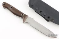 This Paragon by Vehement Knives features a satin finished blade with notched thumbrest, .196" blade stock and 1.025" blade depth, full tang construction. The handle has green canvas micarta scales. Comes with original box, kydex sheath and COA dated May 29th, 2015. Comes with a custom brown leather sheath by Skin Bender. Has a few light scratches, otherwise excellent condition.