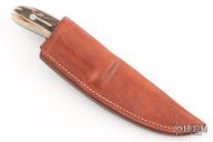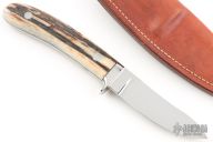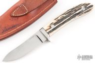 This New Style Knife by the late George Herron features a mirror polished drop point blade, The handle is comprised of a stainless steel guard and stag scales over black liners and full tapered tang construction. Numbered 2565 on bottom side of tang. Includes leather sheath with belt loop. Excellent condition.