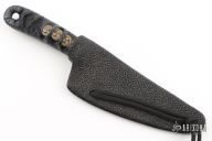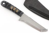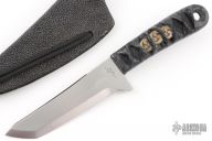 This Jashido by James Piorek of Blade Rigger Custom Knives features a satin finish tanto style blade with swedge, .125" blade stock and 1.180" blade depth. The handle is comprised of a Japanese style wrap with Menuki over hidden tang construction. Includes a stingray skin coated kydex sheath. Comes with a zippered case. Has some light scratches, otherwise excellent condition. #109620