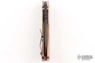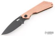 This SMF framelock folder by Mick Strider features a black blade and a gunner grip pattern copper and orange peel finished and anodized titanium frame and tip up titanium clip. Includes a "Lock Bar Stabilizer" for maximum reverse lock retention. Nice detent, lockup and blade seating. New condition.
