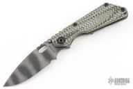 This MS SNG framelock folder by Mick Strider features a tiger striped blade and a tire tread G-10 and flamed titanium frame and tip up titanium clip. Includes Hinderer "Lock Bar Stabilizer" for maximum reverse lock retention. Nice detent, lockup and blade seating. New condition.