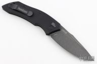This Launch Auto #1 by Kershaw features a blackwash finished blade with swedge. The handle is black aluminum with push button and tip up reversible black stainless steel clip, lanyard hole at the butt. Excellent condition. Comes with original box and papers.
