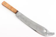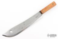 This Foster Bros Knife is made of carbon steel and has .121" blade stock and 2.279" blade depth, full tang construction. The handle has wood scales with brass pins. Has some scratches and oxidation, good condition for its age.