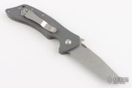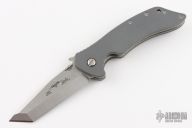 This Hybrid by Emerson Knives features a stonewashed chisel ground tanto blade with thumbdisc and wave feature, notched thumbrest. The handle has gray G-10 scales, titanium liners, satin spacers, tip up stainless steel clip, lanyard hole. Comes with original box and papers. Excellent condition. This knife is from the Signature Series and has been hand signed by Ernie Emerson on the b-side of the blade. S/N0104.