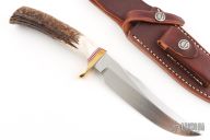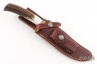This Model 12-6 Little Bear Bowie from Randall Made Knives features a satin finished blade with a sharpened top edge and notched thumbrest, .198" blade stock and 1.242" blade depth, hidden tang construction. The handle has a brass guard and a stag grip, red/white/blue spacers. Comes with a brown leather sheath and original paper wrapping. New condition.