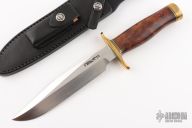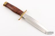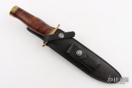 The Model 1 was made famous by Allied combat troops in World War II and has since been widely used in all theaters of war. It has a satin finished blade with sharpened top edge, .218" blade stock and 1.318" blade depth, hidden tang construction. The handle has a brass guard and butt, desert ironwood burl grip with black/brass spacers. Includes black leather sheath and original paper wrapping. New condition.