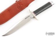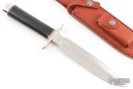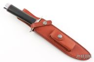 This Model 1-7 from Randall Made Knives features a satin finished clip point blade with sharpened top edge, .227" blade stock and 1.181" blade depth, hidden tang construction. The handle is comprised of a nickel silver guard, red/white/black spacers, black linen micarta handle and duralumin pommel. Comes with brown leather sheath and original paper wrapping. New condition.