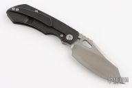This Evolution 3.0 by Custom Knife Factory features a satin finished blade with notched thumbrest and thumbhole. The handle has a stonewashed bark finished titanium frame with a backspacer. Timascus pivot collars and clip. Comes with velcro case and COA. Nice detent, lockup and blade seating. Excellent condition. #531 and dated 8-22.