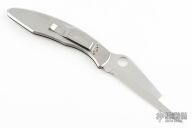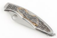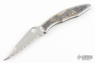 This Police knife by Spyderco features satin finished blade with a thumbhole and fully serrated edge. The handle is stainless steel with an engraved silver and bronze overlay by Gary Blanchard of a "Flying Eagle". Has a tip down stainless steel clip. Comes with a zippered case. Has a couple very light scratches, otherwise excellent condition.  #0143