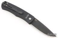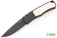 This BR-1.7 Whiskers Design by Protech Knives features a black blade with false top edge. The handle has a black aluminum frame with a black aluminum bolster release, ivory paper micarta inlay, stainless backspacer and tip up black stainless clip. Lanyard hole at the butt. Comes with original box and papers. Excellent condition. PR3#176