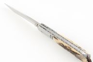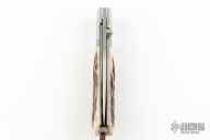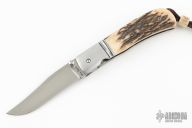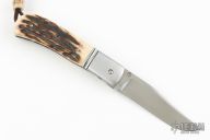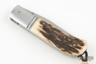 This knife by Alan Davis features a hand rub satin finished blade with a single thumbstud. The handle has fluted stainless steel bolsters, stag scales, fileworked stainless steel liners with jeweled interiors, textured stainless steel backspacer. Nice detent, lockup and blade seating. Excellent condition.
