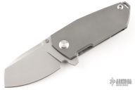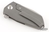 This Bulldog flipper by Alexander Churburkov features a bead blast finished blade with notched flipper. The handle has a bead blast finished titanium frame, backspacer with lanyard hole and tip up clip with hidden screws. Has stainless lockface insert, rides on bearings, nice detent, lockup and blade seating. Includes original box and papers.  Excellent Condition.