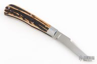 This Back Pocket by Mike Zscherny features a clip point blade with a hand rubbed satin finish and nail nick. The handle has pinched stainless steel bolsters, stag covers with stainless steel escutcheon, stainless steel liners and spring. Half stop on blade, flush in all positions. Comes with a zippered case. Excellent condition.