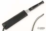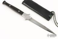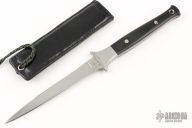 This dagger by Al Mar and Bill Harsey features a double edged blade with hollow ground B-side, .169" blade stock and .602" blade depth, full tapered tang construction. The handle has stainless steel bolsters and black linen micarta scales with red liners. Comes with a black leather neck sheath. Has light scratches, otherwise excellent condition.