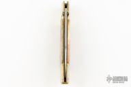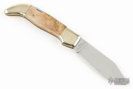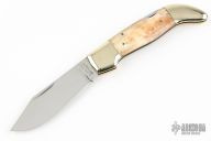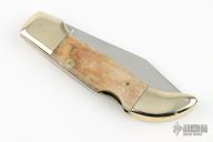 This lockback by Olsen Knives features a mirror finished blade with nail nick. The handle has nickel silver bolsters, bone scales, brass liners and steel backspacer. Has some very light scratches, otherwise excellent condition. Comes with original box.