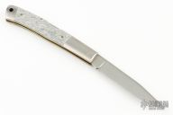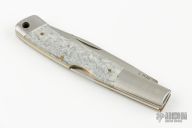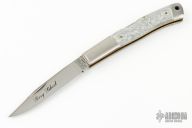 This lockback by Parker Custom Series has a mirror finished blade with nail nick. The handle has stainless steel bolsters, gray/white acrylic covers, brass liners, stainless steel spring. Has a few light scratches, otherwise excellent condition.  Comes with original box.
