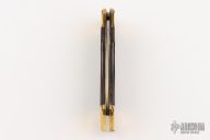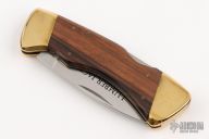 This lockback by Edge Mark has satin finished blade with nail nick. The handle has brass bolsters, rosewood scales, brass liners, stainless steel spring. Has some scratches, otherwise excellent condition. Comes with original box.
