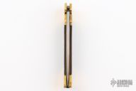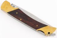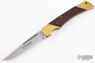 This lockback by Valor has satin finished blade with nail nick. The handle has brass bolsters, rosewood scales, brass liners, stainless steel spring. Comes with original box. Excellent condition.