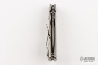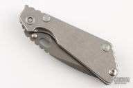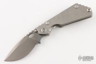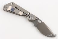 This PT framelock folder by Mick Strider features a black wide belly blade with notched thumbrest and a thumbhole. The handle has a tumble finished titanium frame with matching tip up titanium clip. Nice detent, lockup and blade seating. Has a couple light scuffs, excellent condition otherwise.