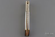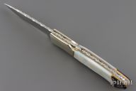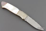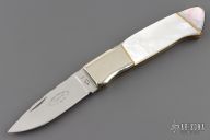 This lockback by J.M.G. (please let us know if you know this makers name) features a satin finished blade with nail nick and fileworked spine. The handle has nickel silver bolsters, mother of pearl scales and black lip pearl rear bolsters, brass spacers and liners, fileworked stainless steel backspacer. Comes with a black nylon sheath. Has a few light scratches, otherwise excellent condition.