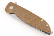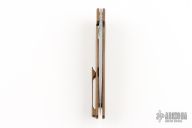 This Rask by John Grimsmo of Grimsmo Knives features a stonewash finished blade with notched flipper. The handle has dragon scale milled, anodized and tumbled titanium frame with matching tip up clip that has hidden screws, titanium barrel spacers and screws. Numbered #2357 on the spine of the blade. Includes original box and COA dated November 30, 2023. Excellent condition.