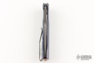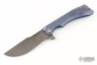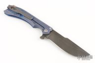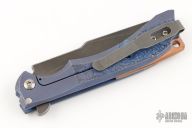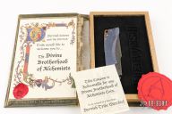 This Alchemy Midtech XL by Dervish Knives features an acid/tumble finished recurve blade with notched thumbrest and a flipper. The handle has a milled and anodized titanium frame with deep carry tip up clip and a copper backspacer. Nice detent, lockup and blade seating. Comes with original box, desquised as a book, also includes Divine Brotherhood of Alchemst's patch and coupon redeemable for coin from the Dervish Tribe Warchief. One of Twelve. Has a couple light scuffs, excellent condition otherwise.