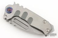 This Micro Praetorian from Medford Knife and Tool features a satin finished drop point blade with notched thumbrest and fullers. The handle has a stonewashed titanium frame with an anodized titanium tip up pocket clip. Stainless steel backspacer doubles as a glass breaker. Comes with original hard case and papers dated May 31, 2023. Excellent condition.