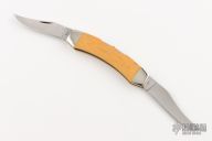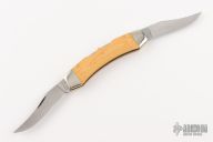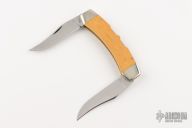 This Texas Lock Horn by Case Knives features two satin finished blades with nail nicks. The handle has nickel silver bolsters, yellow paper micarta scales, brass liners and stainless steel backspacers. Comes with a tooled brown leather sheath, original box and papers. Excellent condition.