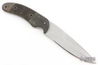 This Fighter by Jim Hammond features a bead blasted double edged blade with notched thumbrest, .175" blade stock and 1.243" blade depth, full tapered tang construction with satin black linen micarta scales. Numbered "1" on the blade. Has some light oxidation on the blade, otherwise excellent condition.