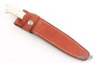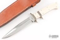 This sub-hilt fighter by Harold Corby features a mirror polished blade with sharpened top edge, .186" blade stock and 1.007" depth, full tapered tang construction. The handle has an engraved nickel silver guard and sub-hilt, mammoth ivory scales and nickel silver pins, red liners. Comes with a brown leather sheath, not original but fits nicely. Has a crack in one of the scales, otherwise excellent condition.