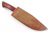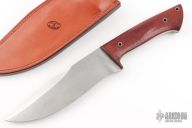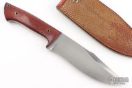 This knife by Jason Knight features a hand rub satin finished recurved blade with a sharpened top edge, .224" blade stock and 1.977" blade depth, full tang construction with a mild taper. The handle has rosewood scales.  Includes a custom brown leather sheath with lizard skin overlay by Paul Long. Has a few light scratches and patina, otherwise excellent condition.