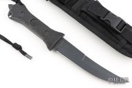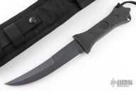This Jordan by Samuel Staniforth features a black blade with false top edge, .207" blade stock and 1.400" blade depth, full tang construction with rubber scales. Comes with a nylon sheath. Has a few light scuffs, otherwise excellent condition.