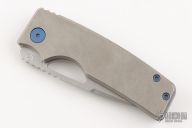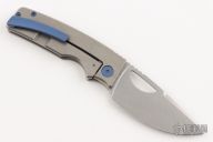 This knife by the OZ Machine Company features a tumbled Magnacut blade with thumbhole and notched thumbrest. The handle features a smooth blast and tumble finish titanium frame with an anodized titanium backspacer and tip up clip with hidden screws. Includes box and papers dated 2-5-24 and s/n 2945. Excellent condition.