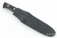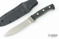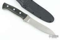 This KS-5 Large Elk Hunter by Dozier knives features a satin finished drop point blade with .196" blade stock and 1.047" blade depth, full tang construction. The handle has black linen micarta scales with aluminum pins. Comes with kydex sheath with belt loop. Excellent condition.