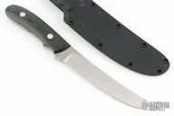 This K-23 Fillet by Dozier Knives features an upswept satin finished blade with .124" blade stock and .921" blade depth, full tang construction. The handle has black linen micarta scales with aluminum pins and lanyard hole. Comes with a kydex sheath. Excellent condition.